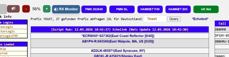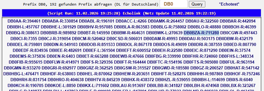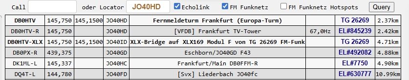 Hier werden alle Relais mit Echolink oder FM-Funknetz Zugang angezeigt. Beim Aufruf über das Menü wird zuerst das Ergebnis vom letzen Aufruf angezeigt (damit es schneller geht)